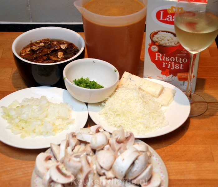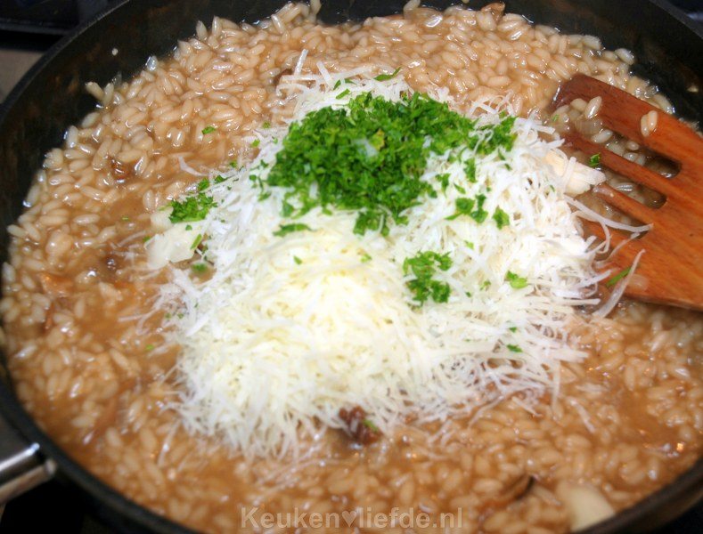 Roer tot slot de champignons, peterselie, blauwe- en geraspte kaas door de risotto en warm nog kort even door.