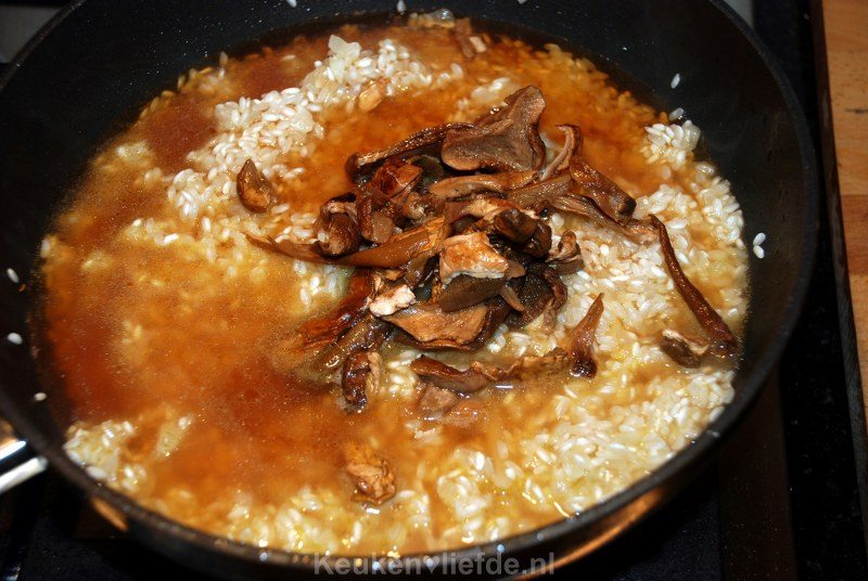 Voeg de risotto toe en bak kort even mee. Blus de risotto af met de witte wijn en laat even verdampen. Snijd de porcini in iets kleinere stukjes en voeg ze samen met het weekwater en wat bouillon toe, zoveel totdat de risotto net onder staat.