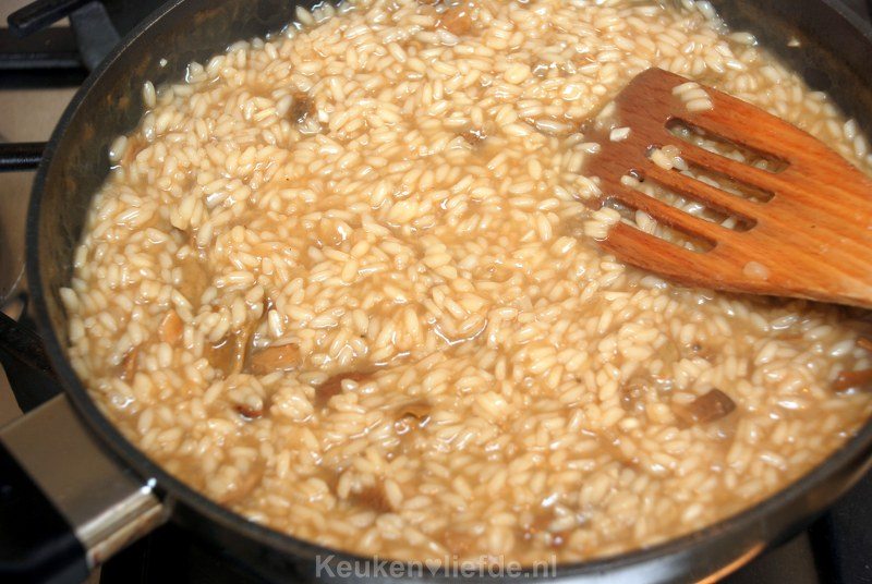 Blijf constant op middelhoog vuur door de risotto roeren, de risotto moet zachtjes pruttelen. Voeg steeds opnieuw, als het vorige bijna is opgenomen, een beetje bouillon toe, net zolang totdat de risotto beetgaar is.