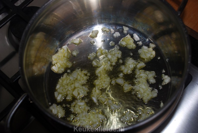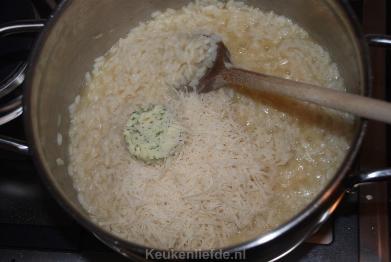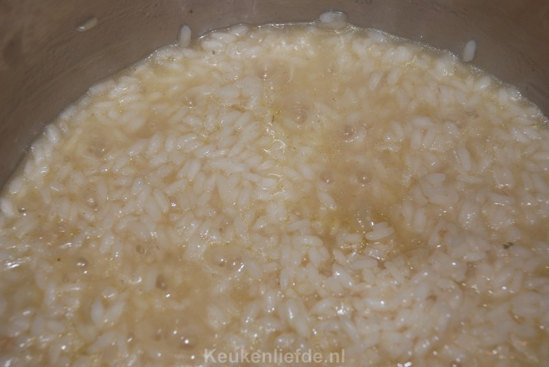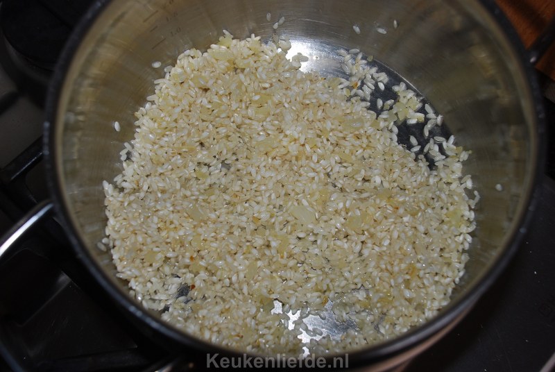Pel en snipper ondertussen het sjalotje en fruit deze zacht in een pan met wat olijfolie. Voeg dan de risotto toe en fruit nog even mee.