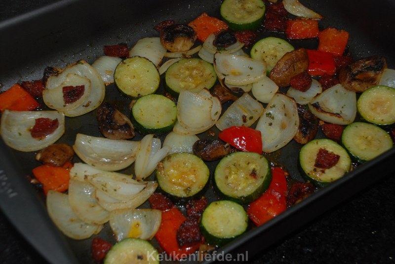 Verwarm de oven voor op 200 graden. Snijd de groenten en een stukje chorizo in gelijke stukken en verdeel ze over een ovenschaal of braadslee. Besprenkel ze met olijfolie en maal er wat zeezout over uit de molen. Rooster de groenten ongeveer 30 minuten in de oven of totdat ze goudbruin worden. Roer de groenten af en toe even om.