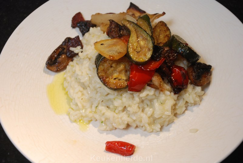 Schep de risotto op borden en verdeel de geroosterde groenten erover.