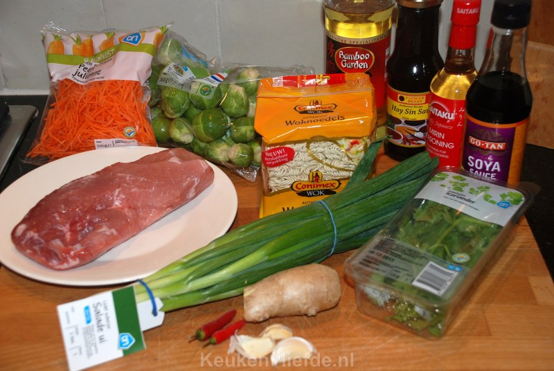 Ik ben dol op dit Oosterse roerbakgerecht met knapperig gewokte spruitjes, wortel en gemarineerd varkensvlees. Hoe langer je het vlees marineert, hoe intenser de smaak en malser het vlees wordt. Heb je echter wat minder tijd, dan volstaat een halfuurtje marineren ook al prima.