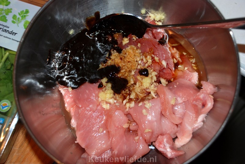 Verhit de wok met wat olie en roerbak het gemarineerde vlees totdat het net gaar is.