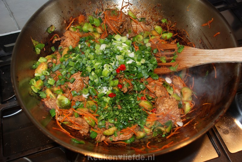 Voeg het vlees weer toe en warm even mee. Roer op het laatst de lente-uitjes, chilipeper, sesamzaadjes en koriander erdoor.