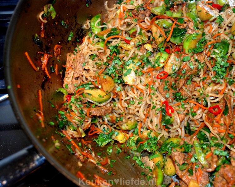 Schep het vlees op een bord en zet zolang opzij. Roerbak de spruitjes 1 minuut in de rest van de olie. Voeg de wortelsliertjes toe en roerbak nog een minuut.