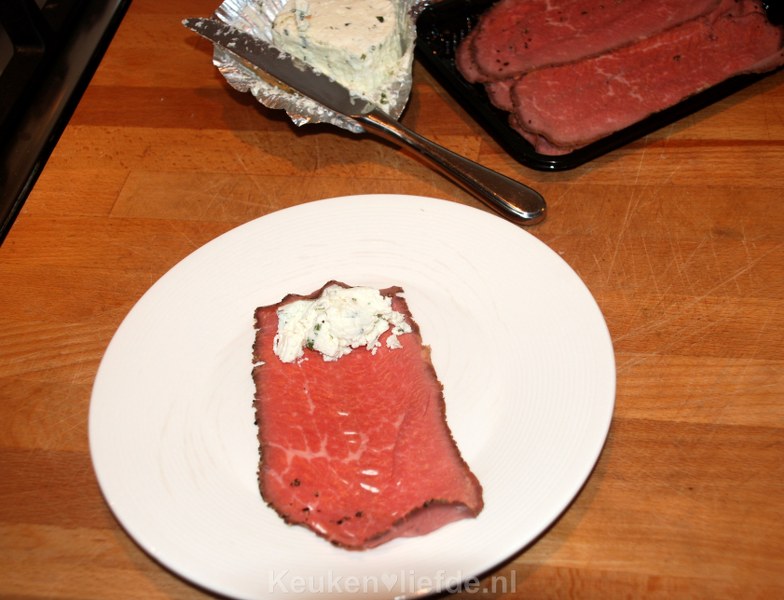- Ongeveer 12-14 iets dikker gesneden plakken rosbief (ik gebruikte peperrosbief, zeker een aanrader!)