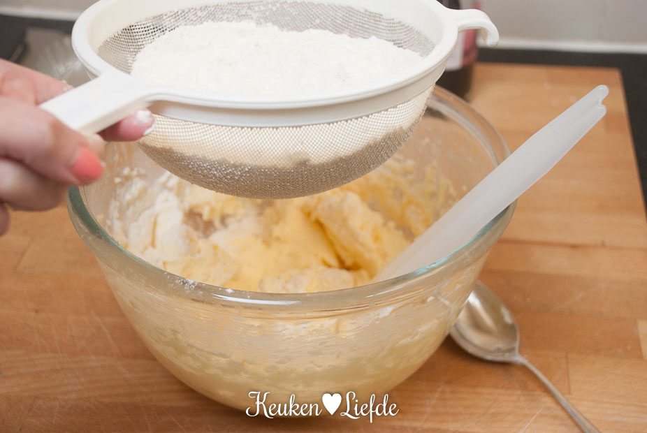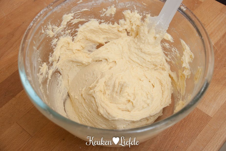 Klop de boter met de suiker tot een luchtig en romig mengsel. Voeg één voor één de eieren toe, terwijl je goed blijft kloppen.