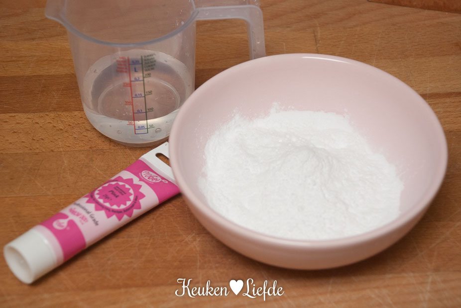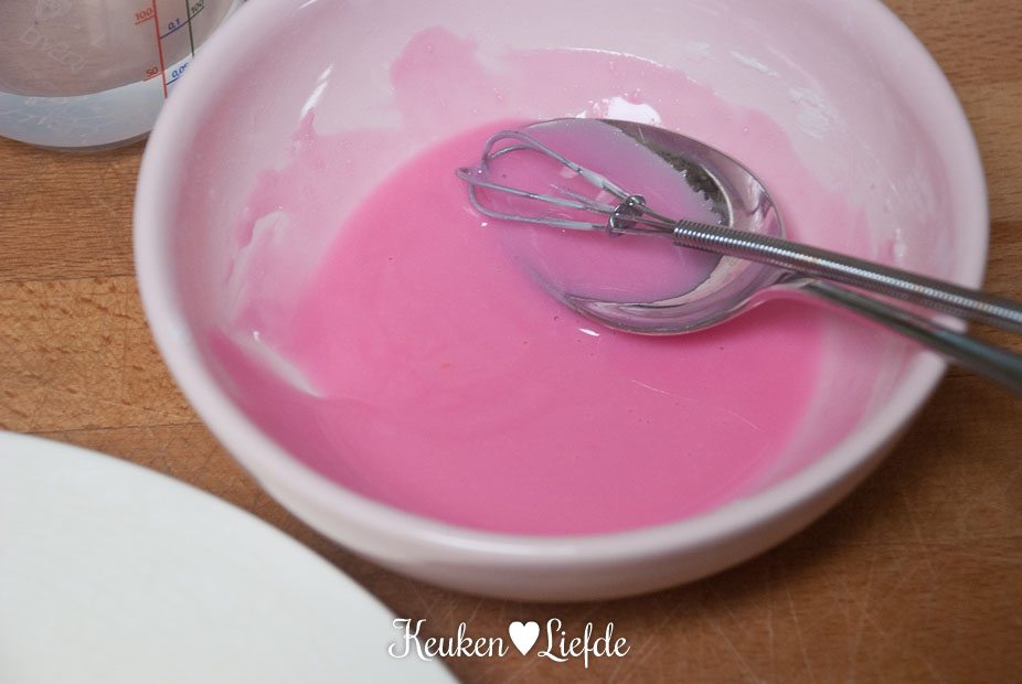 - Roze levensmiddelenkleurstof (bietensap of het sap van fijngeprakte aardbeien kan ook)