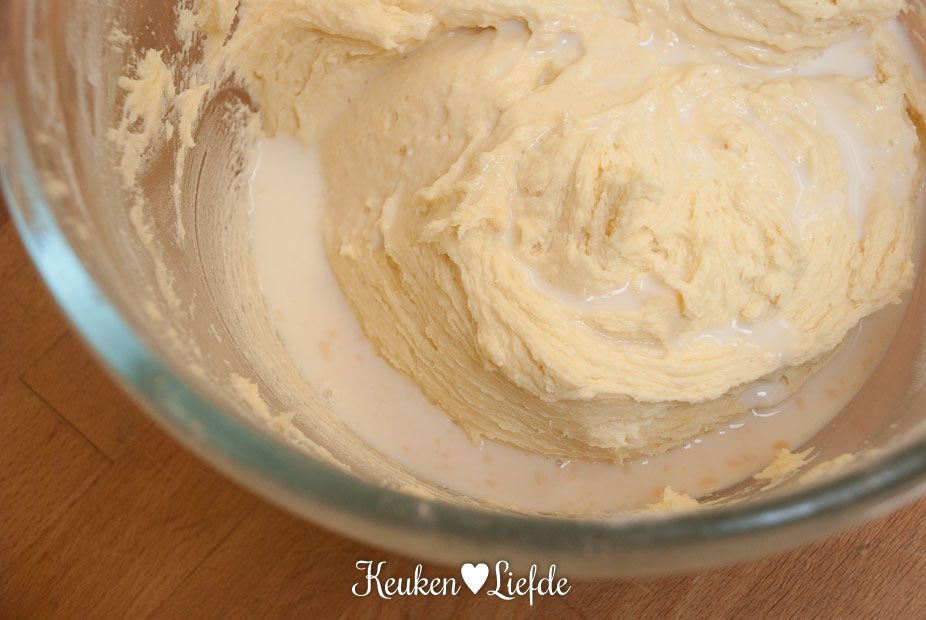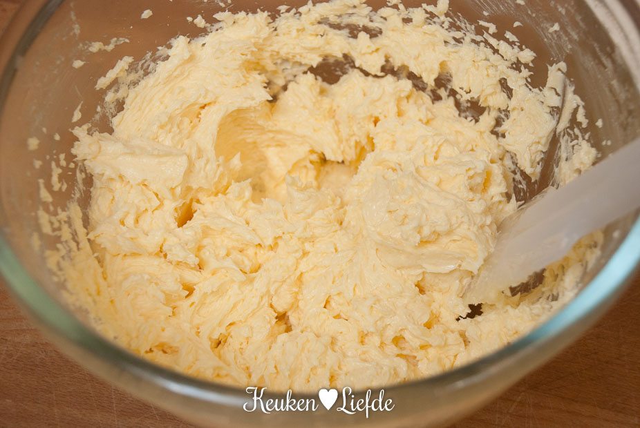 Klop de boter met de suiker tot een luchtig en romig mengsel. Voeg één voor één de eieren toe, terwijl je goed blijft kloppen.