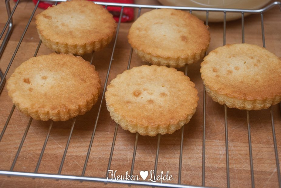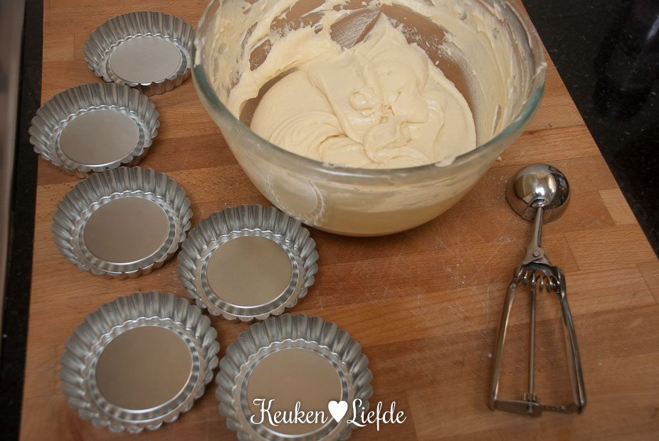 Kleine ronde bakvormpjes met gekartelde rand (tartelette vormpjes), of eventueel een muffinblik kan ook, elektrische handmixer, zeef, spatel, eventueel een ijsknijper