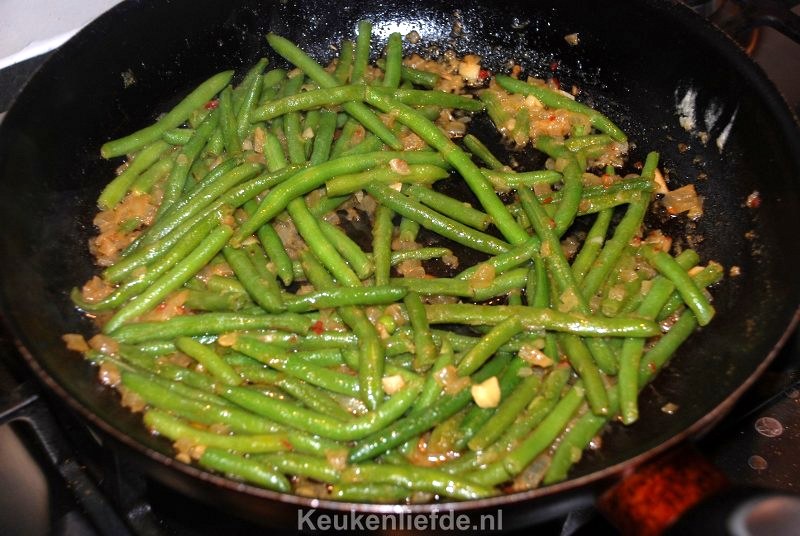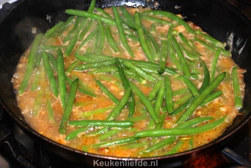 Dat kun je ook wel gebruiken hoor Rianne. 🙂 Voeg een scheutje kokosmelk toe als de saus is ingedikt en warm samen met de sperziebonen even door.