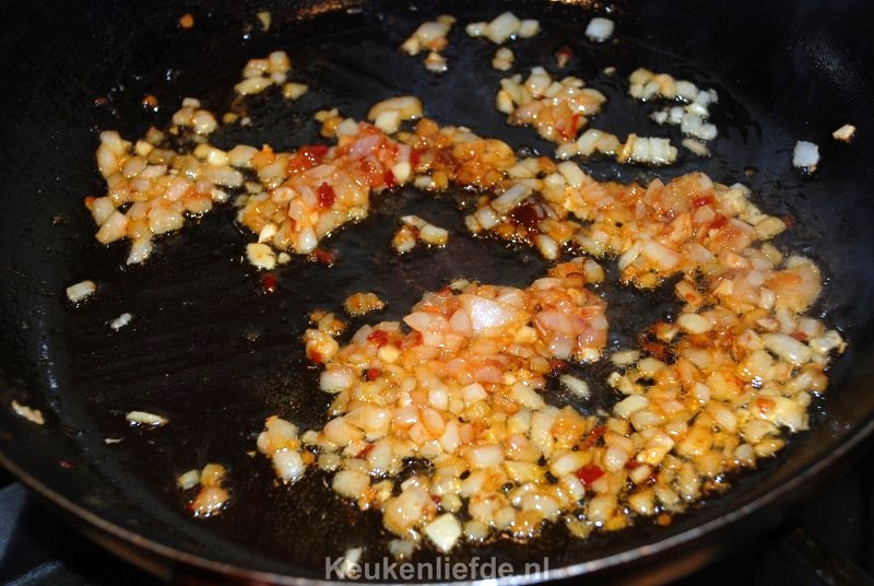 Klein stukje trassi (garnalenpasta en stinkt ontzettend, maar onmisbaar) meefruiten met de uien en wat verse blaadjes djeroek purut. Zo heb ik het geleerd van mijn indische moeder.
