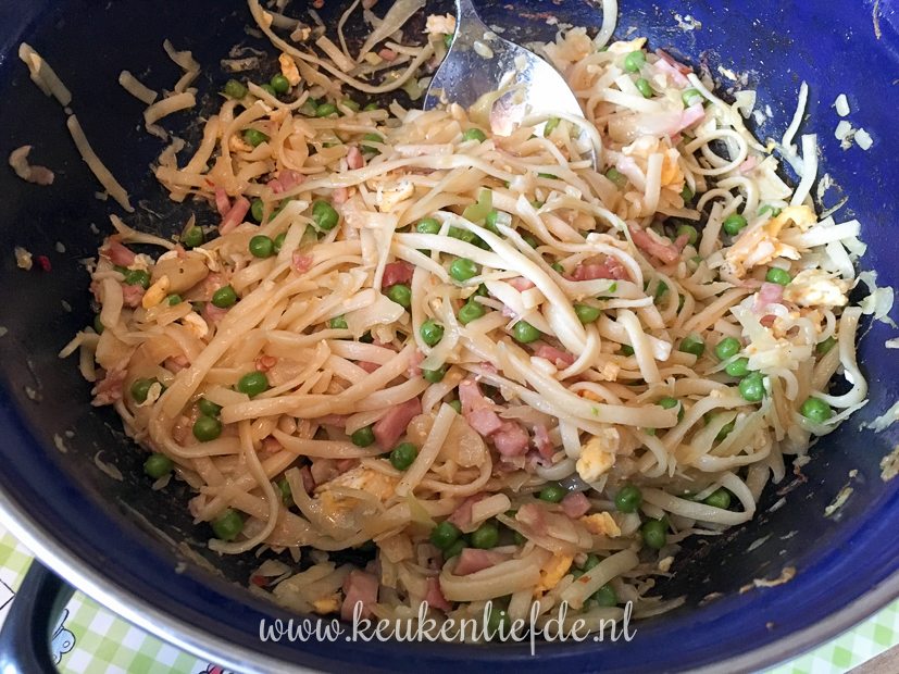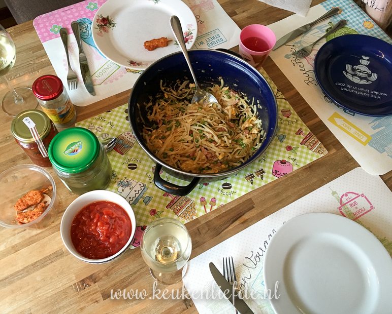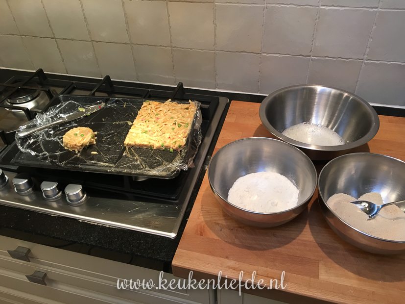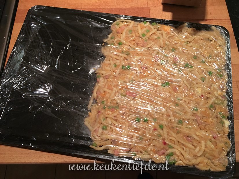 Na het eten duik ik nog even de keuken in. Van het laatste restje bami wil ik bamischijven maken. Ik meng de bami met een dikke saus, strijk dit uit over een bakblik en zet het een nachtje weg in de koelkast om op te stijven. Morgen ga ik ze paneren.