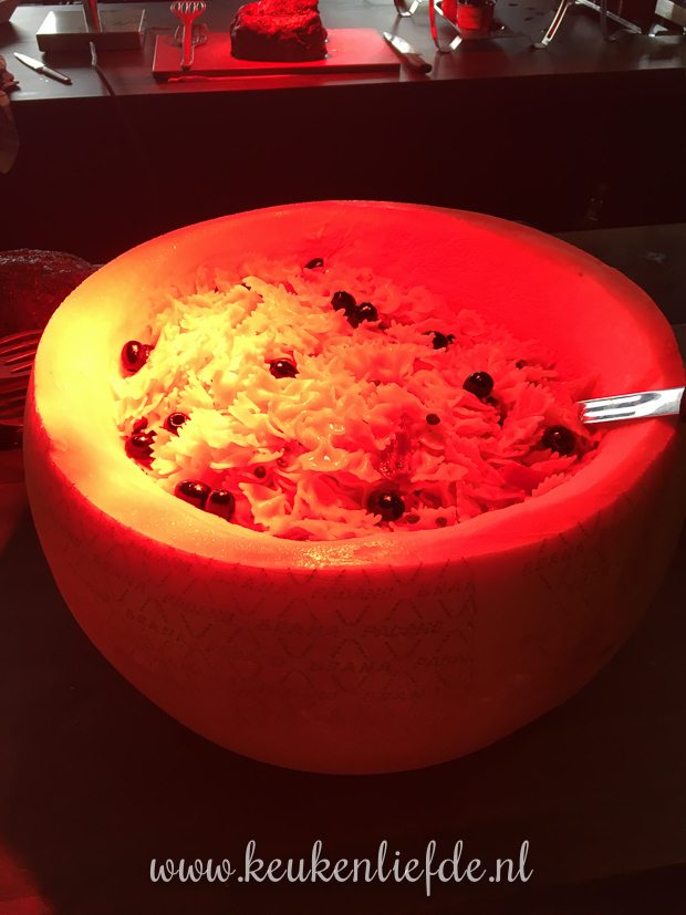 - Een uitholde Parmezaan gevuld met strikjespasta.