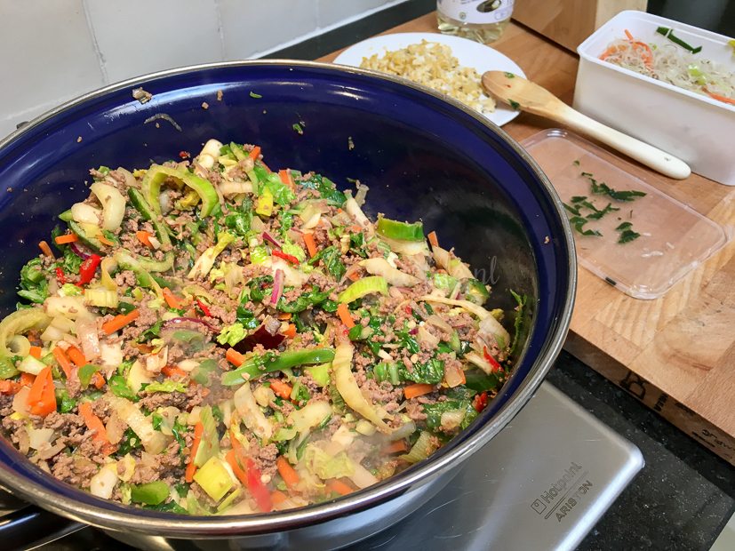 Ella-Marie logeert tot morgen bij mijn schoonouders en zo kan ik weer even een dagje werken. Ik haal ’s ochtends een bak mihoen uit de diepvries van de afhaalchinees. Met wat extra groenten, gehakt en roerei maak ik daar ’s avonds een lekker maaltje mee.