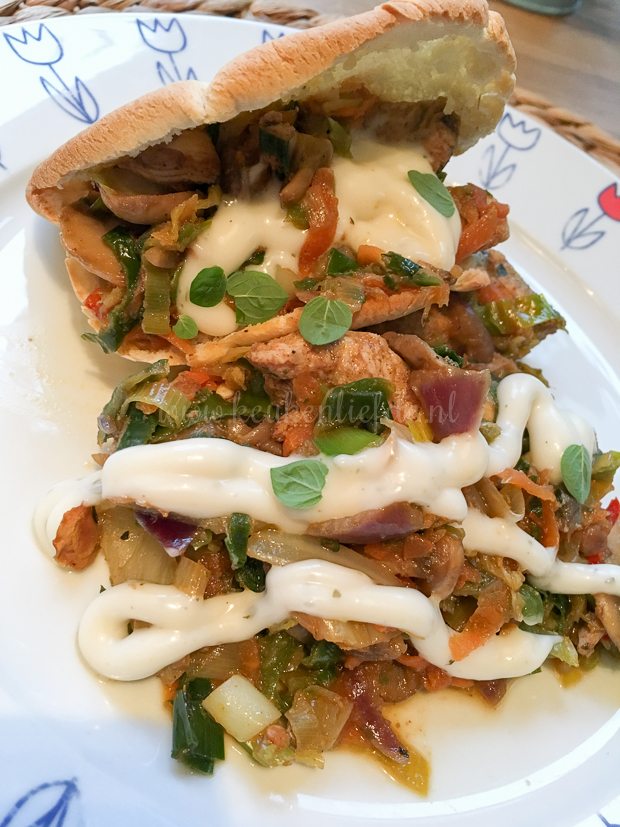 Na het eten wordt Ella-Marie thuisgebracht. Als El op bed ligt eten Johan en ik zelfgemaakte kip kebab (het recept voor zelfgemaakte kebab kruidenmix vind je hier) met heel veel groenten, knoflooksaus en pitabroodjes.
