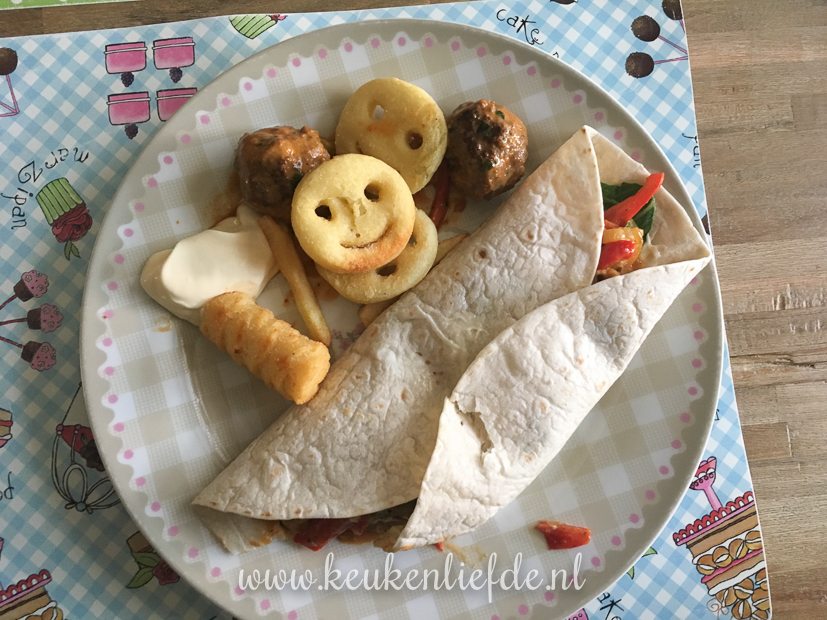 Ik heb nog een kliekje eten over van het stroganoff-pannetje met gehakballetjes (recept komt eraan!). Dat smaakt over prima op een wrap! Erbij serveer ik wat aardappelkroketjes en smileys die ik uit de diepvries viste. Een prima makkelijke maandag maaltijd!