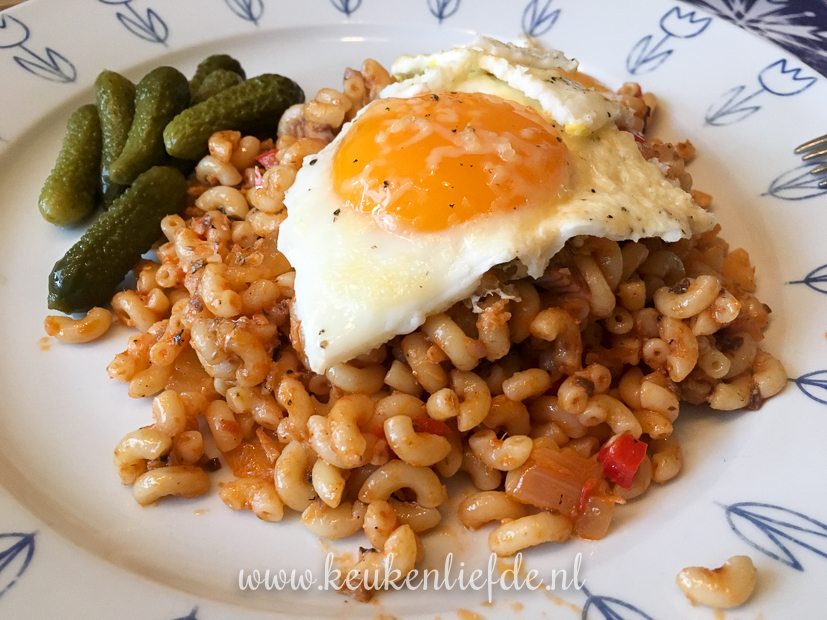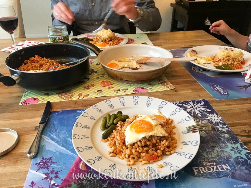 We eten de macaroni die ik overhad van dinsdag. Met een gebakken eitje erbij.