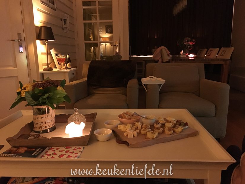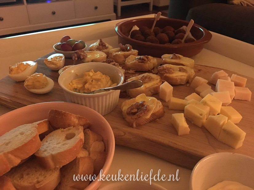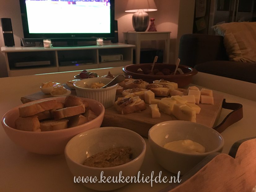 Op tafel staan gevulde eitjes, eiersalade, bitterballen, stokbroodjes met brie, walnoot en honing en blokjes kaas. Het wordt uiteindelijk 4 -1 voor onze jongens. Joehoe!