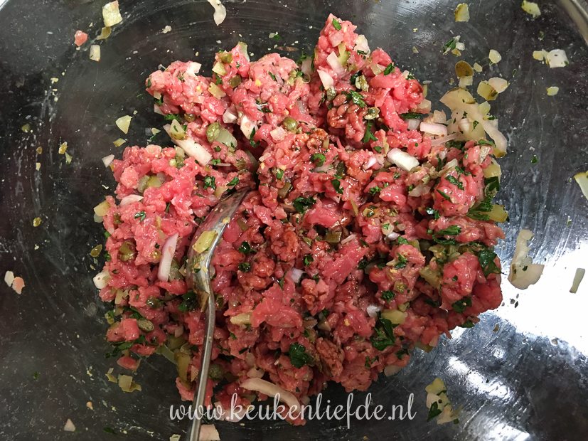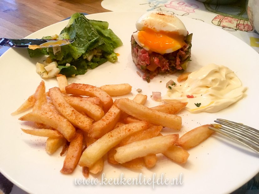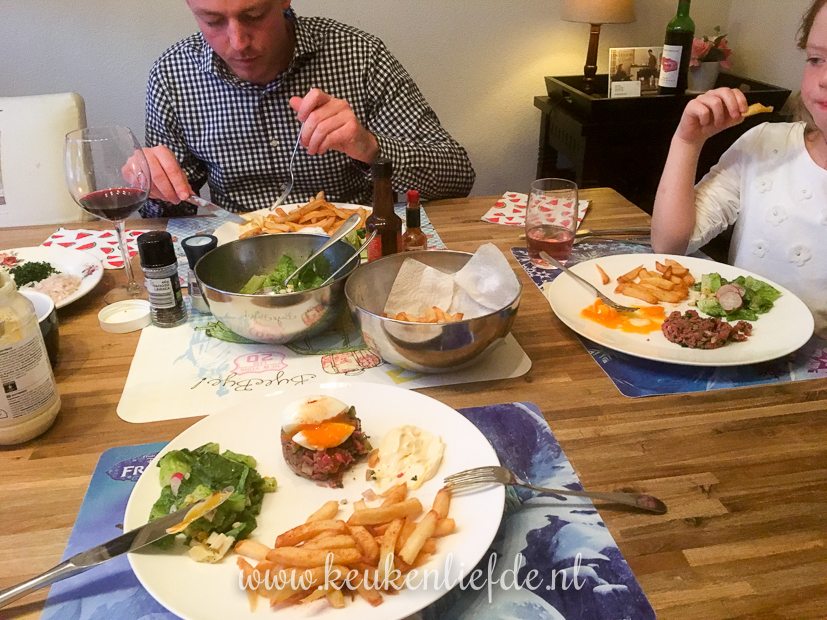 ’s Avonds eten we steak tartare met zelfgemaakte frieten. Gemaakt door papa!