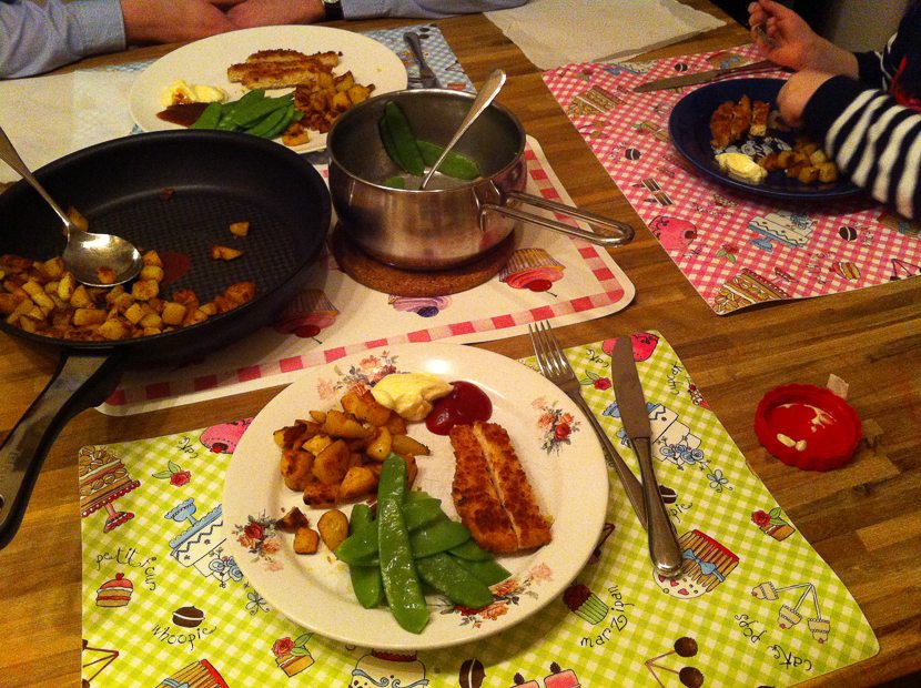 Al dagen hunker ik naar gebakken aardappels, kipschnitzel en gekookte peulen en besluit dat vandaag de dag is. Jawel, met een klodder mayo en ketchup erbij. Simpel en schandalig lekker!