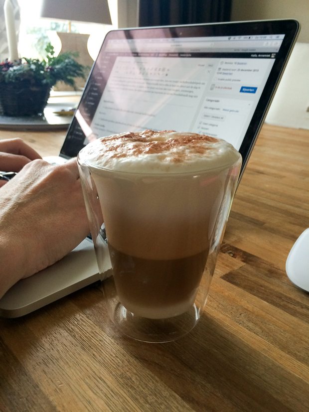 Ik start de dag met een latte macchiato achter mijn laptop. Krijg er nog steeds geen genoeg van.