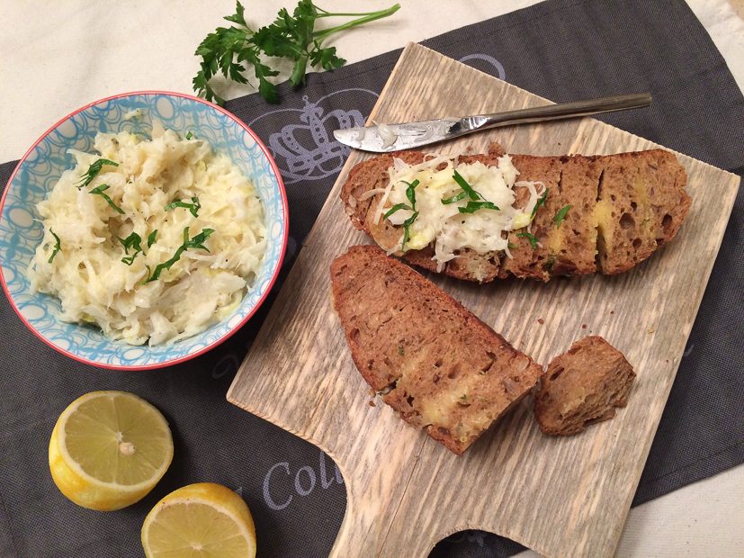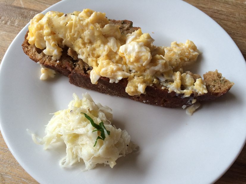 Ik lunch met een dikke plak landbrood, belegd met het perfecte roerei en kabeljauwsalade. Jammie!