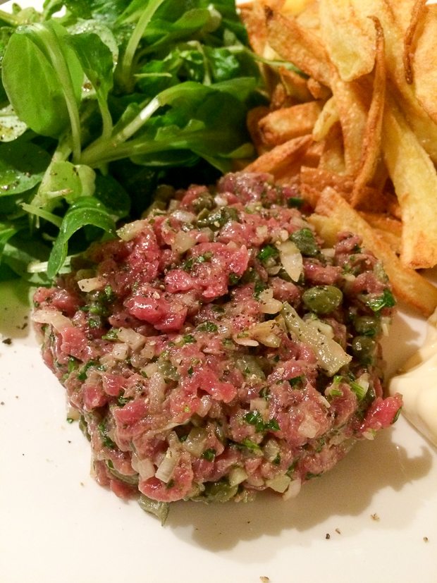Johan en ik eten ’s avonds ons favoriete maaltje: steak tartaar met zelfgemaakte frieten. Ik zit er serieus over te denken om dit met kerst te eten. Misschien tartaar van Black Angus. Mmmm …