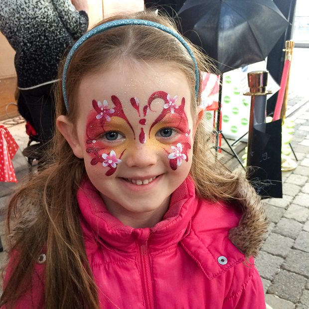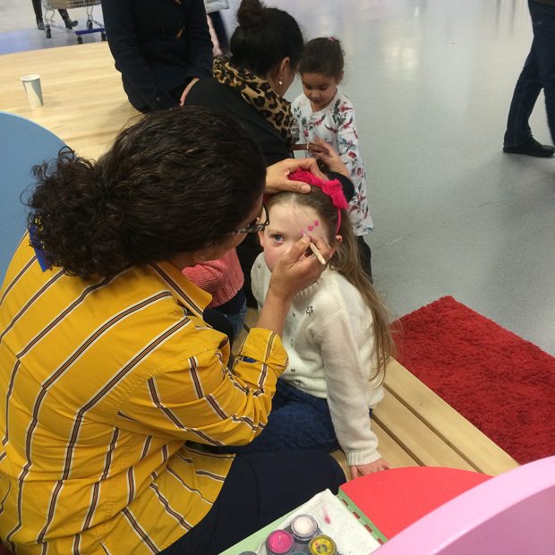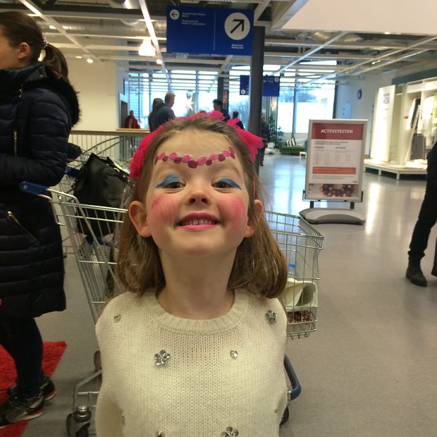 We gaan uiteindelijk naar huis met een tafel en stoel voor in de keuken. De tafel wil gaan gebruiken voor het maken van foodfoto’s. Die maak ik nu altijd op het aanrecht, maar dat is erg krap. Bij de uitgang van IKEA mag Ella-Marie zich nog een keertje laten schminken.