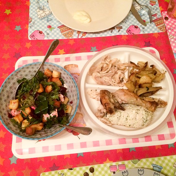 Tijdens mijn Newcastle-tripje vorig jaar oktober genoot ik van een waanzinnig lekkere lunch bij de Cook House. Sindsdien was ik vastberaden een soortgelijke lunch zelf te maken en besluit dat vandaag de dag is. Op het menu staat een hele gebraden kip met crème fraîche en dragon, aardappels en venkel uit de oven met aïoli en een salade met bietjes, geitenkaas en walnotenpesto. Missie geslaagd, het was wáánzinnig lekker!