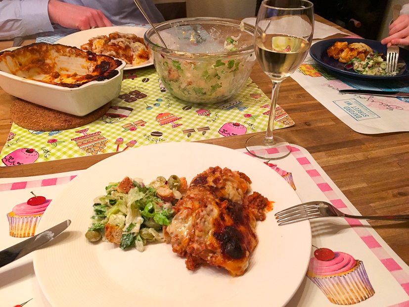 Afgelopen zaterdag maakte ik twee schalen lasagne waarvan ik er een bewaarde in de koelkast. Weer een makkie dus voor het avondeten, want ik hoef de schaal alleen maar in de oven te schuiven, een salade te maken en de tafel te dekken.
