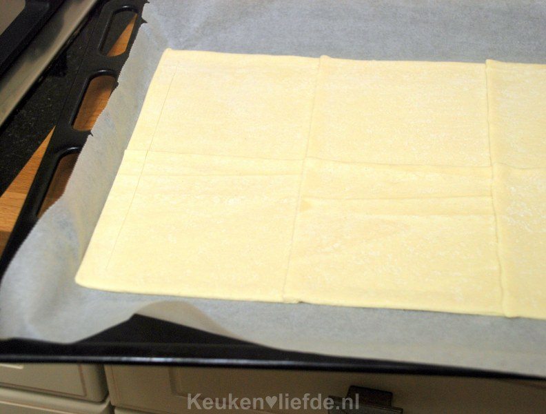 Verwarm de oven voor op 220 graden. Bekleed een bakblik met bakpapier en leg de plakjes bladerdeeg erop. Laat de randen iets overlappen en druk ze aan. Snijd rondom, op circa 1 cm van de rand vandaan, met een mes in het bladerdeeg.