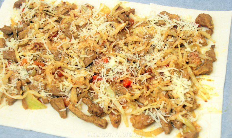 Verdeel de shoarma over het bladerdeeg, binnen de ingekerfde rand (de buitenste rand gaat in de oven rijzen, waardoor je een mooi opstaand randje krijgt) en bestrooi met de geraspte kaas.