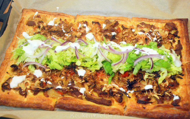 Bak de shoarmataart circa 15 tot 20 minuten in de oven, of totdat het bladerdeeg goudbruin is. Snijd de taart in stukken en beleg met de sla, ui en knoflooksaus.