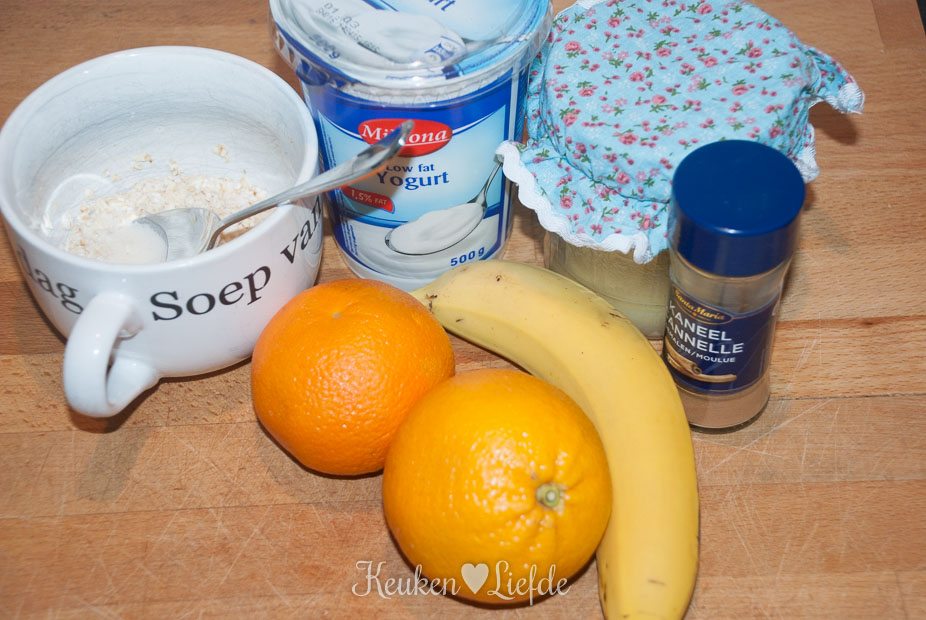Doe de havermout met het weekwater en de yoghurt in de blender. Knijp het sap van de sinaasappels boven de blender uit en voeg de gepelde banaan toe. Voeg naar eigen smaak een snufje kaneelpoeder en een kneepje honing toe en meng alle ingrediënten tot een gladde en romige shake.