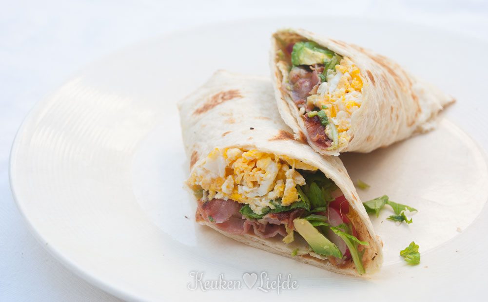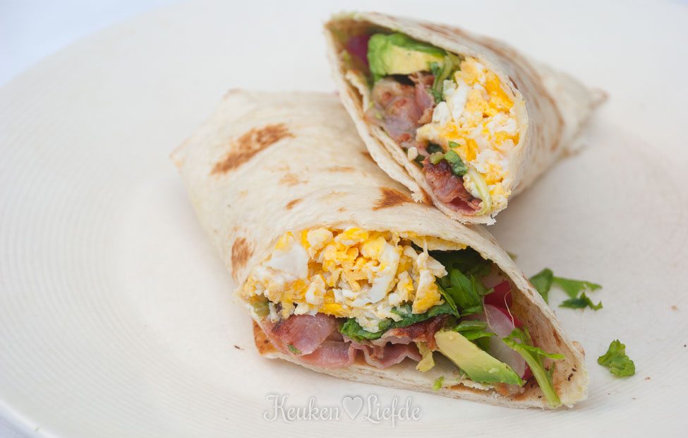 Dit recept is gebaseerd op huevos rancheros: een stevig Mexicaans ontbijt bestaande uit een tortilla belegd met gebakken eieren, overgoten met pittige tomatensaus en geserveerd met rijst, avocado of bonen. Geïnspireerd door dit gerecht bedacht ik mijn eigen ontbijtwrap en vul de tortilla met roerei, avocado en knapperig uitgebakken ontbijtspek. Mmmm … Natuurlijk smaakt deze goed gevulde wrap heerlijk als ontbijt- of lunchgerecht, maar geserveerd met een lekkere groene salade erbij zou het zelfs als avondvullend hoofdgerecht niet misstaan. Welk moment van de dag je ook kiest: je wordt er gegarandeerd blij van!