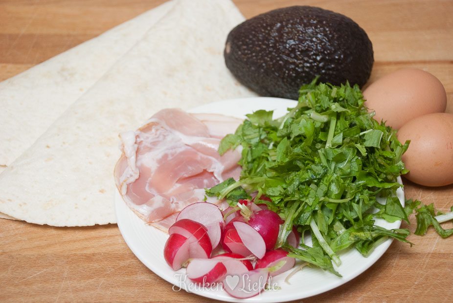Bak de plakjes ontbijtspek krokant uit in een droge koekenpan en laat ze uitlekken op een stukje keukenpapier. Bak in het overgebleven spekvet de tortillawrap, totdat hij licht goudbruin is en haal hem uit de pan. Voeg indien nodig een klein scheutje olijfolie toe aan de koekenpan en voeg de eieren toe. Zet het vuur uit en roer met een houten lepel totdat ze net gaar zijn. Breng indien gewenst op smaak met zout en peper. Leg de tortilla op een bord en beleg met wat sla, roerei, avocado, spek en radijsjes.