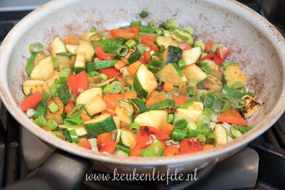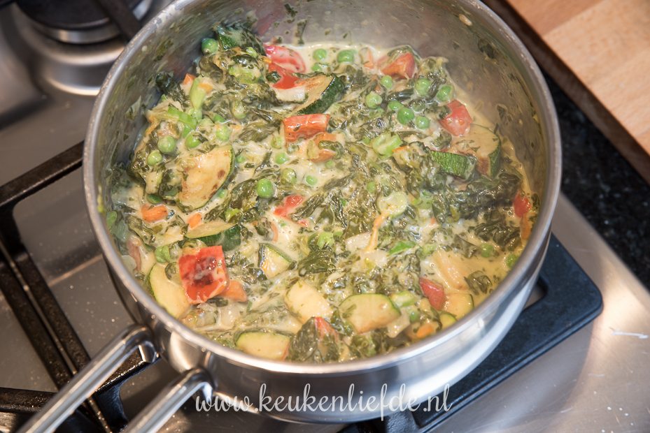 Ik voegde nog extra groenten (1/2 courgette, 1/4 winterpeen, en 1/2 rode paprika in blokjes gesneden) uit de koelkast toe die ik even aanbakte in de koekenpan en daarna door de spinazie mengde.