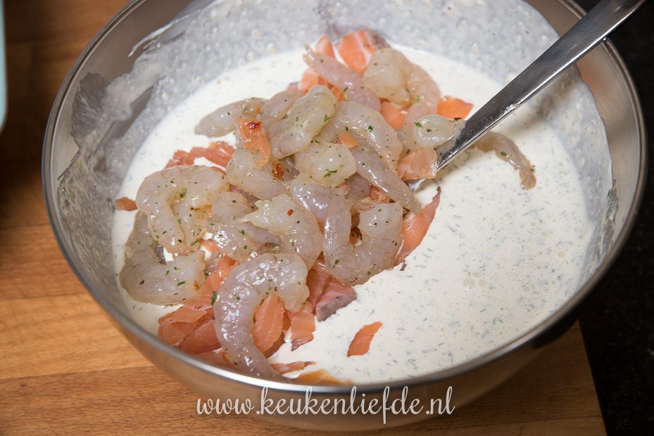 Ontdooi de spinazie volgens de omschrijving op het pak. Snijd de zalmfilet in blokjes en de gerookte zalm in reepjes. Roer de crème fraîche, ricotta en dille door elkaar en roer de zalm en garnalen erdoor. Breng op smaak met zout en peper.