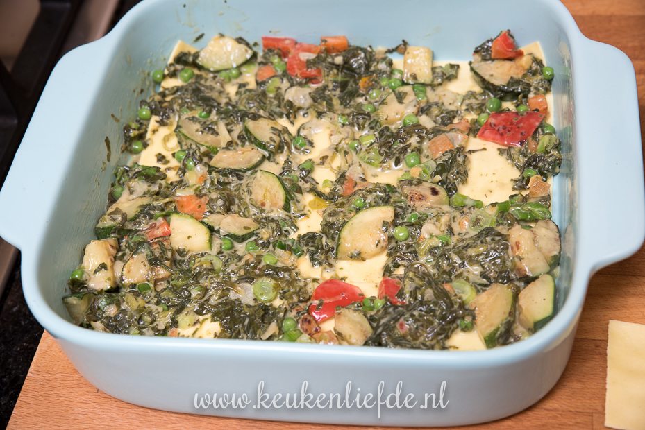 Verdeel om en om de lasagnebladen, spinazie, lasagnebladen, vismengsel bovenop elkaar. Eindig met het vismengsel en bestrooi met de geraspte kaas.