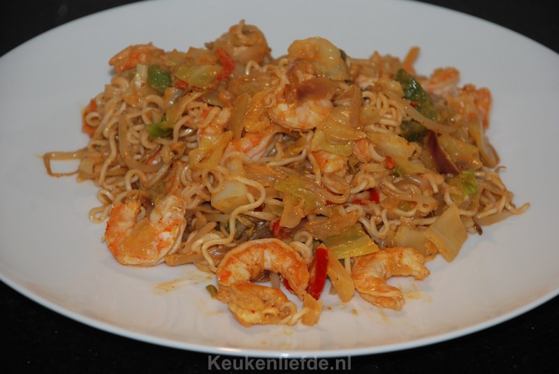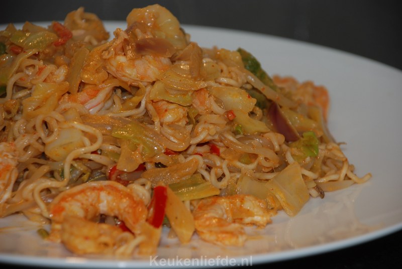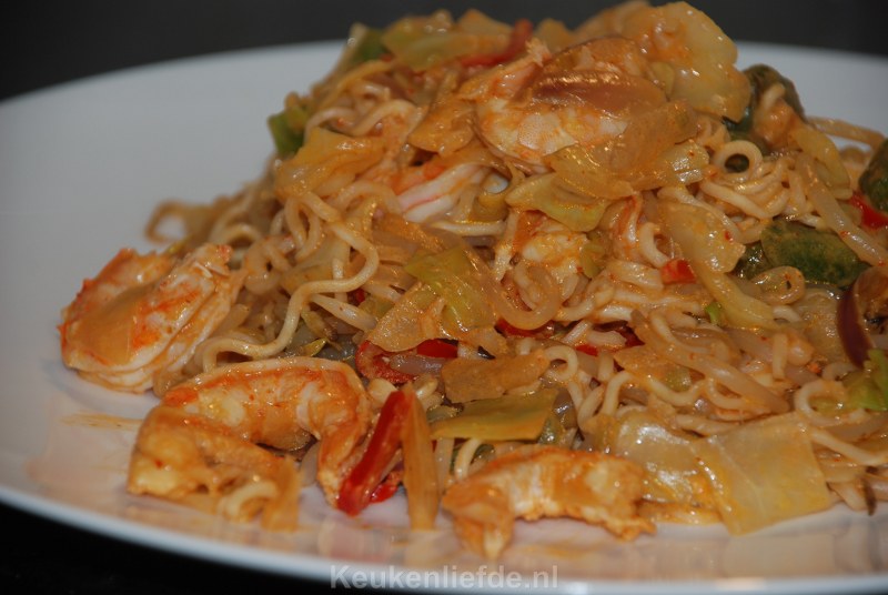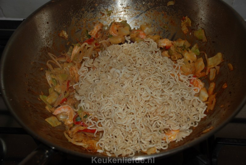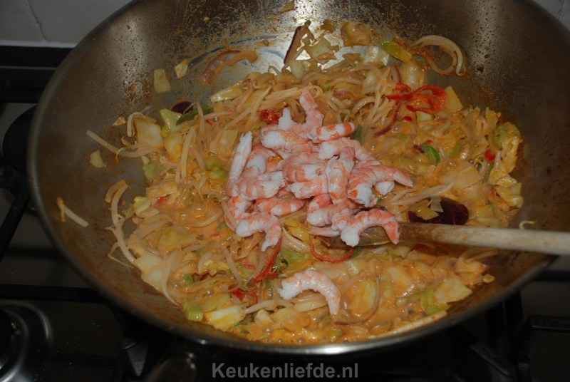 Bereid ondertussen de roerbaknoedels volgens de gebruiksaanwijzing. Als de groenten beetgaar zijn en de saus iets is ingekookt voeg je de garnalen toe.