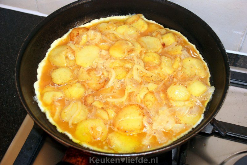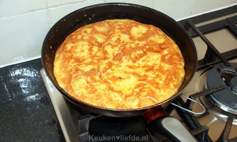 Doe een deksel op de pan en laat het ei stollen. Als de bovenkant bijna helemaal gestold is, keer je de tortilla om op een groot bord en schuif de tortilla omgekeerd weer terug in de pan. Bak nog kort even verder, totdat het ei helemaal gestold is.