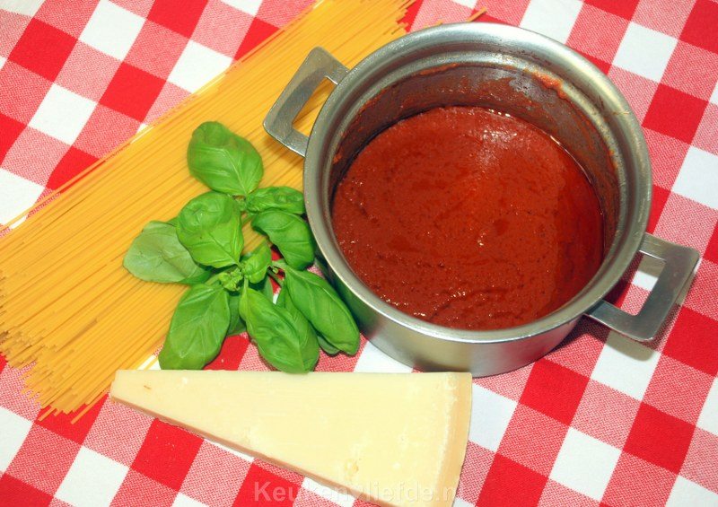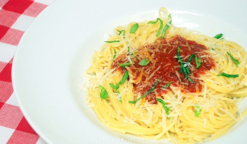 Inmiddels zijn we alweer heel wat jaartjes samen en heb ik me verzoend met het feit dat sommige dingen in het leven simpelweg onverklaarbaar zijn. Totdat mijn man vorige week geheel uit zichzelf de keuken indook om deze spaghetti met rode tomatensaus te maken! En als klapper op de vuurpijl heeft hij er gruwelijk van zitten smullen! Ik denk dat hij wel tien keer heeft gezegd, hoe lekker hij het vond. Ha! Dat hoef je mij natuurlijk niet te vertellen, maar om dat nu na al die jaren uit zijn mond te horen? Echt, de wonderen zijn de wereld nog lang niet uit.