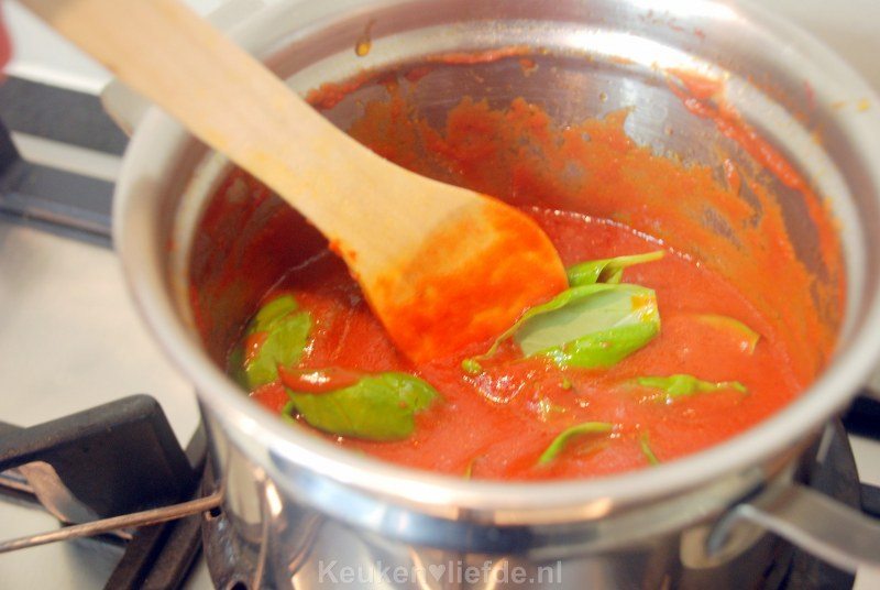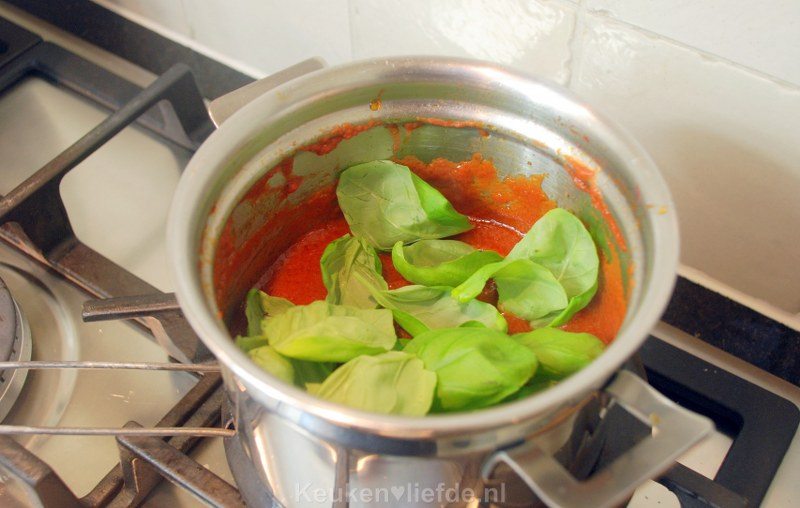 Verwarm de tomatensaus met de verse basilicum (houd de mooie en kleinste basilicumblaadjes achter de hand) en laat enkele minuten zachtjes doorpruttelen. Verwijder daarna de basilicum.