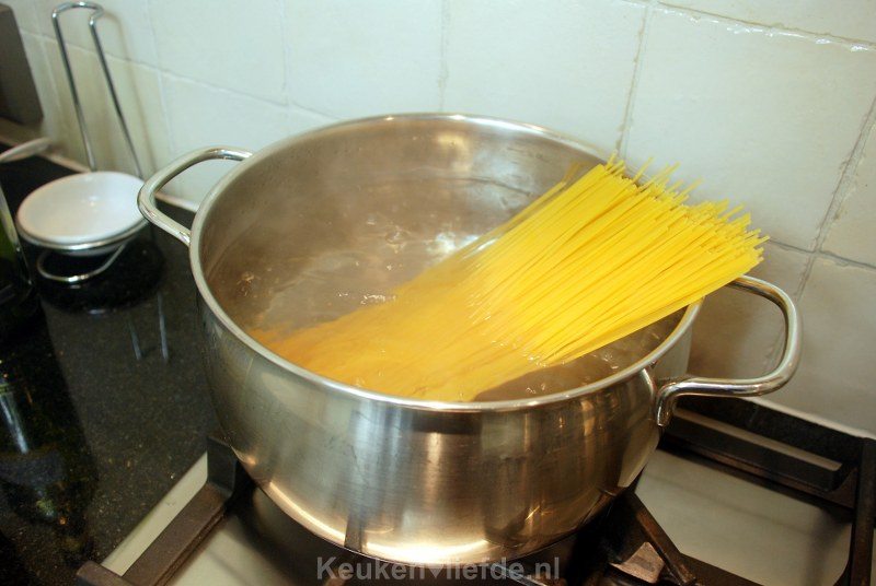 Breng een ruime kookpan met licht gezouten water aan de kook en kook de spaghetti, volgens de beschrijving op het pak, beetgaar.