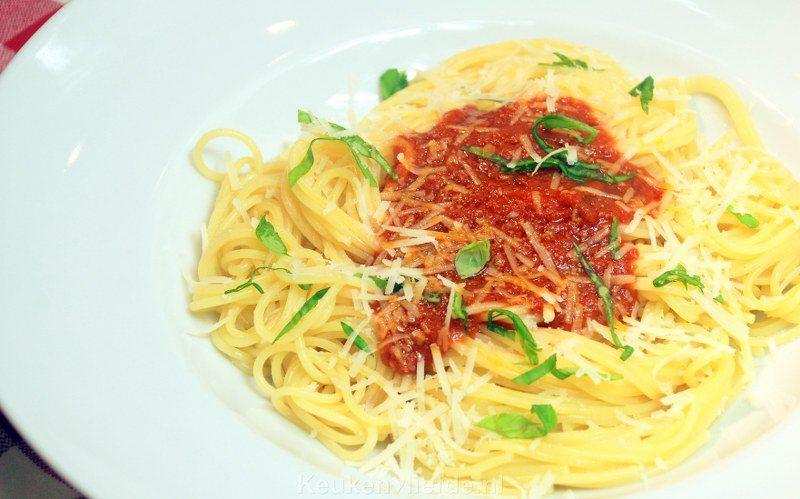 Spaghetti met tomatensaus, basilicum en Parmezaan