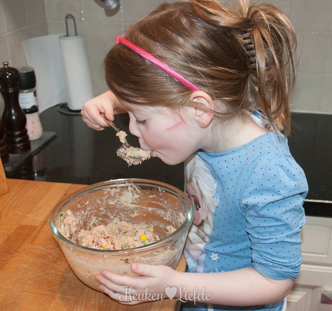 Roer in een kom alle ingrediënten voor de koekjes door elkaar en vorm er met je handen kleine, ronde koekjes van. Dit gaat makkelijk en snel met een ijsschep met knijper. Schep de ijsschep vol met puree en strijk de bovenkant af. Knijp het bolletje puree op je hand en druk hem lichtjes plat. Je krijgt zo mooi gevormde koekjes die allemaal even groot zijn. Heb je geen ijsschep, doe het dan gewoon op gevoel.