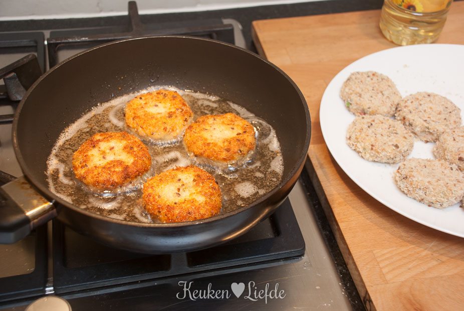 Zet drie borden klaar met losgeklopt ei, bloem en broodkruim. Wentel de koekjes eerst door de bloem, dan het ei en tot slot het broodkruim. Als de puree te zacht is, laat de koekjes dan eerst opstijven in de koelkast voordat je verder gaat.