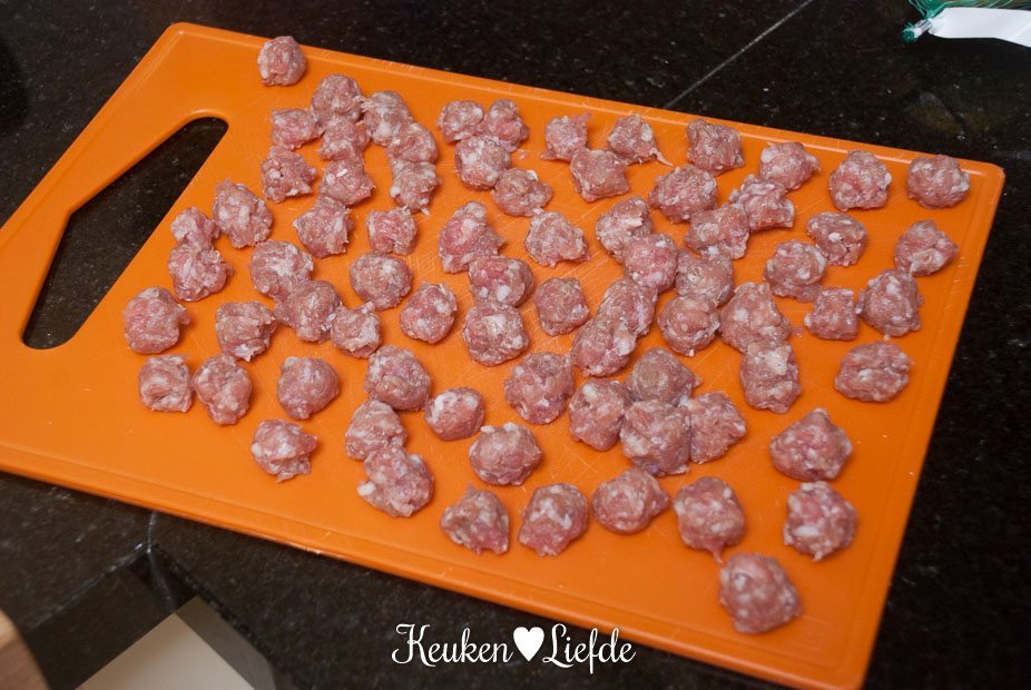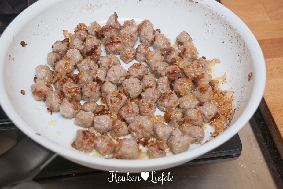 Verhit ondertussen als de pasta kookt, de koekenpan met wat olie en bak de worstballetjes rondom goudbruin. Voeg halverwege de ui toe en bak mee.
